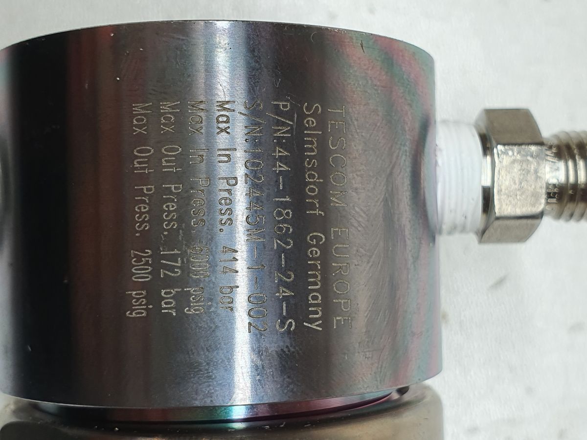 The Tescom 44-1862-24S (part of the 44-1800 Series piston-sensed pressure reducing regulators) is a high-pressure gas regulator designed for controlled reduction of supply pressure in industrial, test, and process systems. Rated for very high inlet pressures up to 6000 psi (414 bar) and providing a regulated outlet up to 2500 psi (172 bar), it delivers stable, repeatable downstream pressure for general-purpose, high-pressure gas applications.